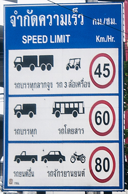 J’ai trouvé ce panneau pour indiquer les vitesses limites dans Bangkok rue Charoen Nakon mais je ne sais s’il correspond à cette rue ou à toutes les rue de Bangkok ou à toutes les routes de Thaïlande!